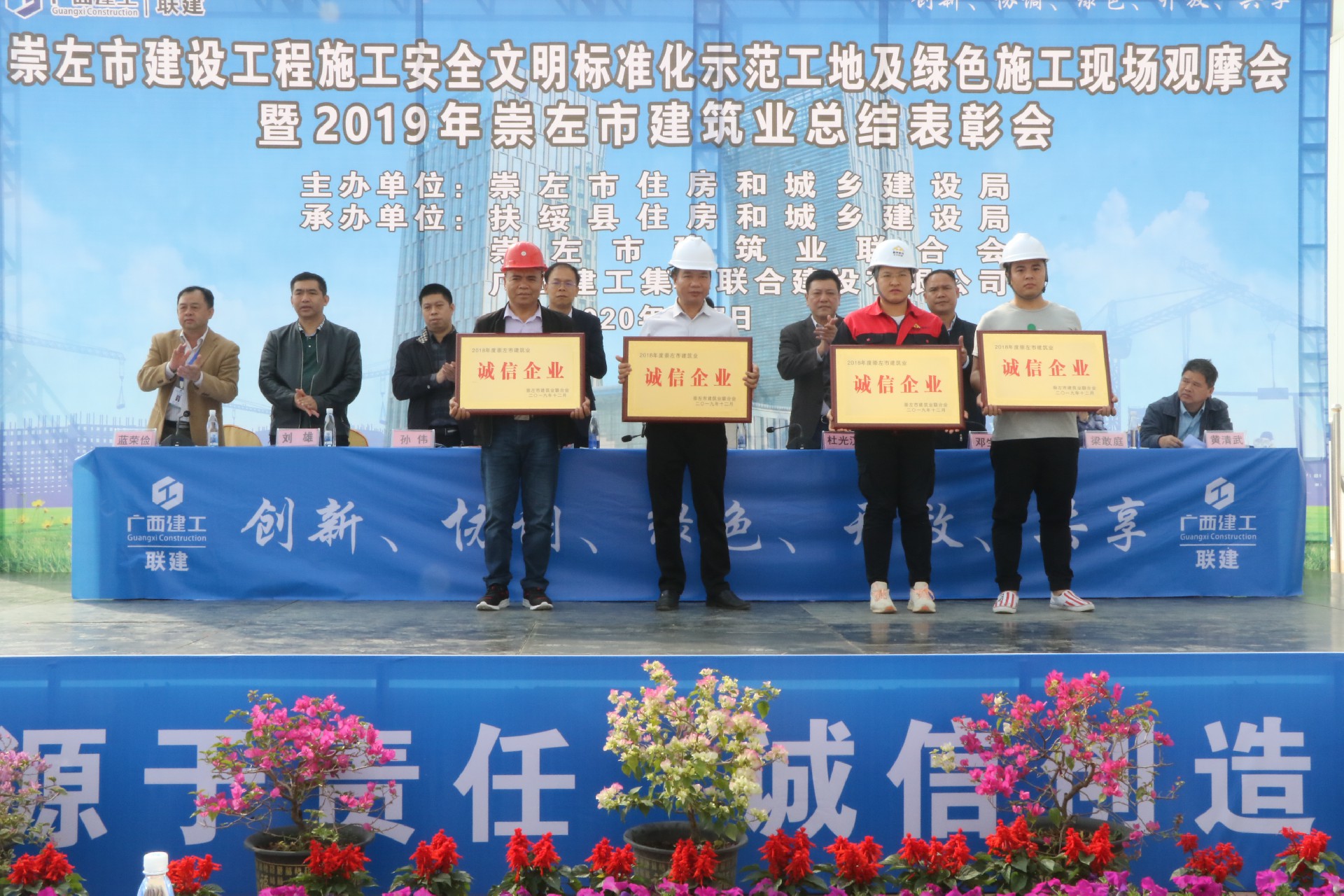 會議還表彰了“2019年崇左市建設工程‘花山杯’獎(最高質量獎)”、 “2019年崇左市建設工程施工安全文明標準化工地”、 “2019年崇左市建設工程優質結構獎”、 “2018年度崇左市建筑業先進集體和個人”,并為獲獎單位、先進工作者代表頒發了獎牌證書。